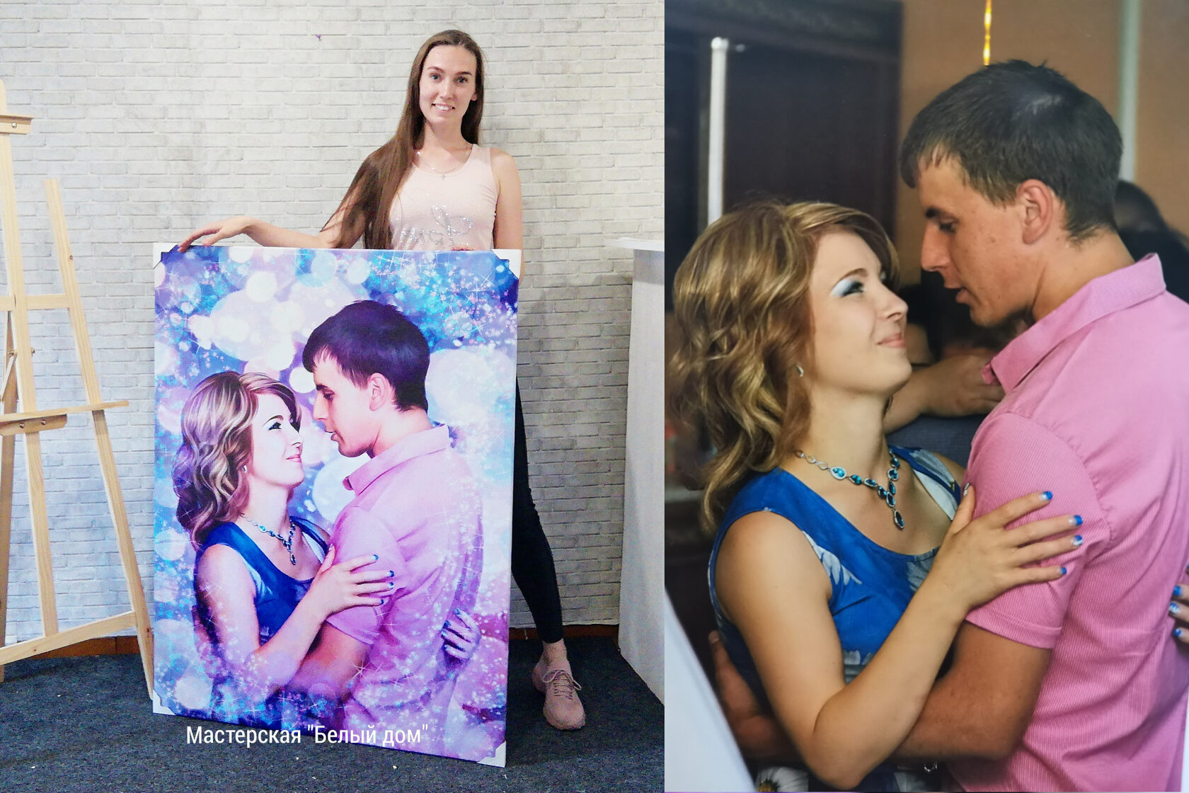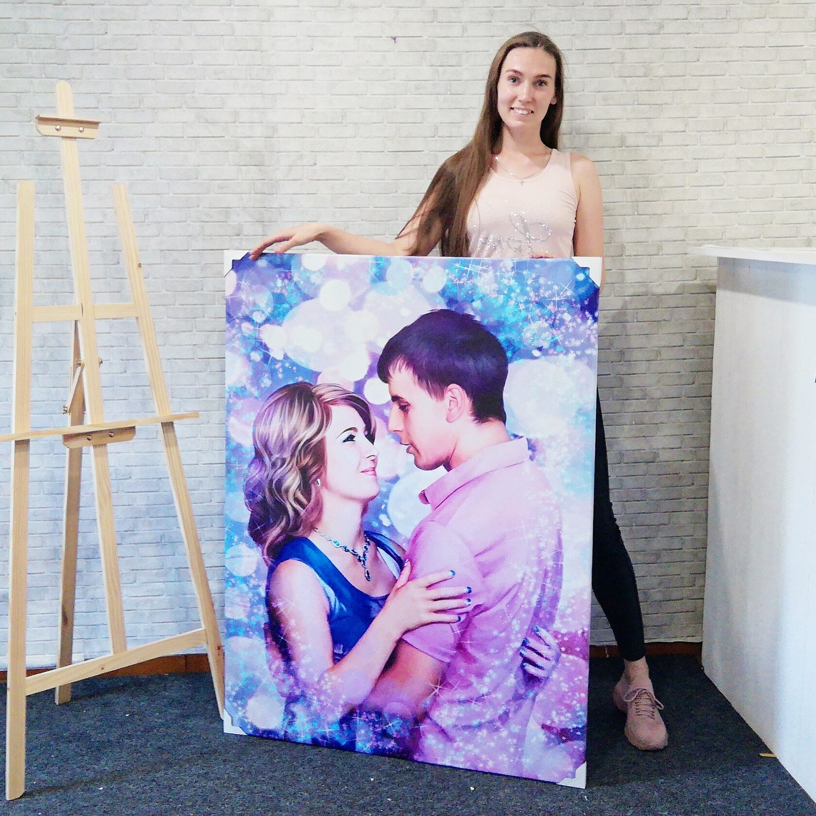 Картина с портретом в стиле Дрим-арт Блики создается нашими художниками вручную. В процессе этой художественной обработки производится замена фона, ретушь, цветокоррекция и кропотливая прорисовка всех элементов.